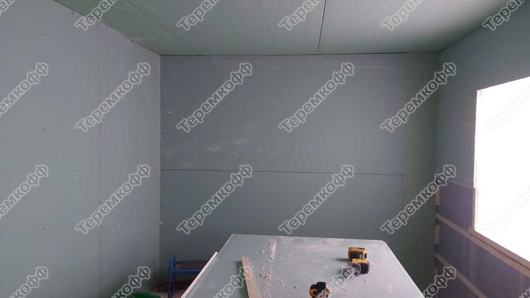 - Внутренняя отделка стен сделана из влагостойких листов гипсокартона (ГКЛВ).