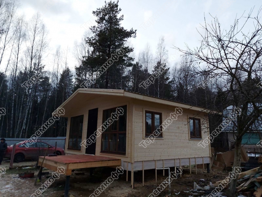 Завершено строительство дачного дома по проекту «Светлая» в Нижегородской области. Перед строительством по просьбе заказчика внесены изменения в проект дома. Площадь крыльца была увеличена, и его проекция смещена вправо. Была изменена внутренняя планировка комнат: объединена кухня с гостиной, убрали санузел и увеличили размер окон.