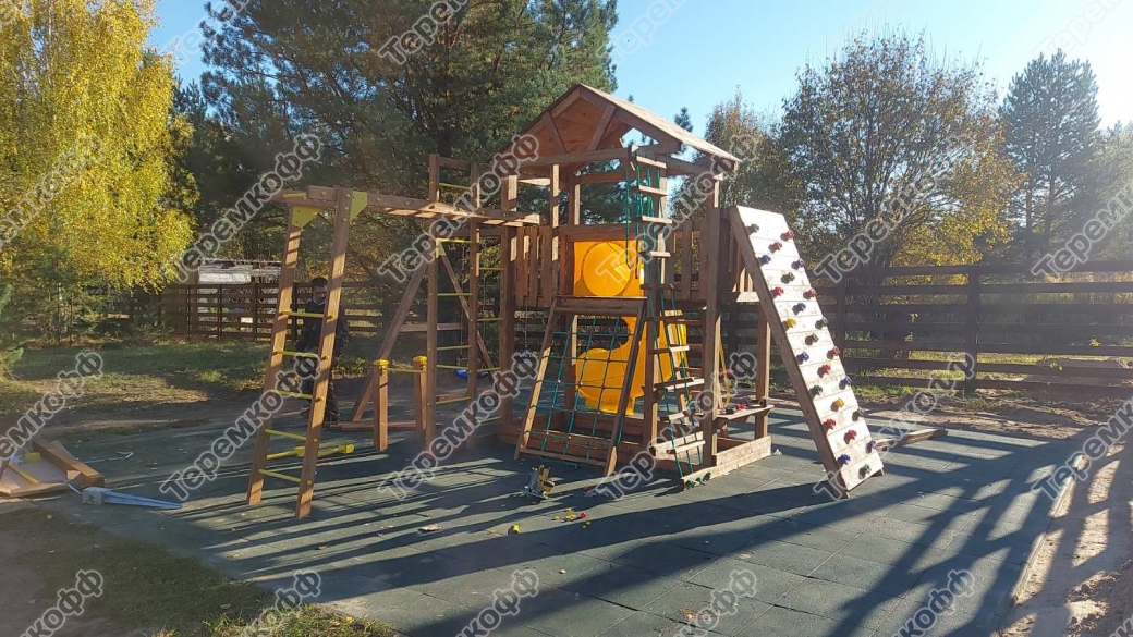 Территория возле гаража благоустроена: установлен забор, место для парковки, дорожки, монтаж детской площадки.