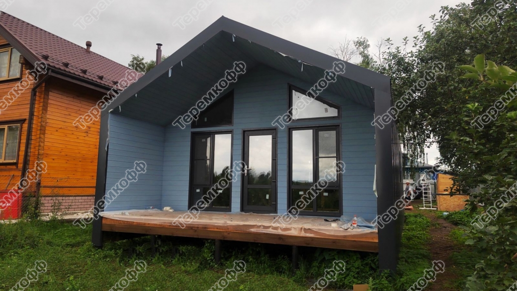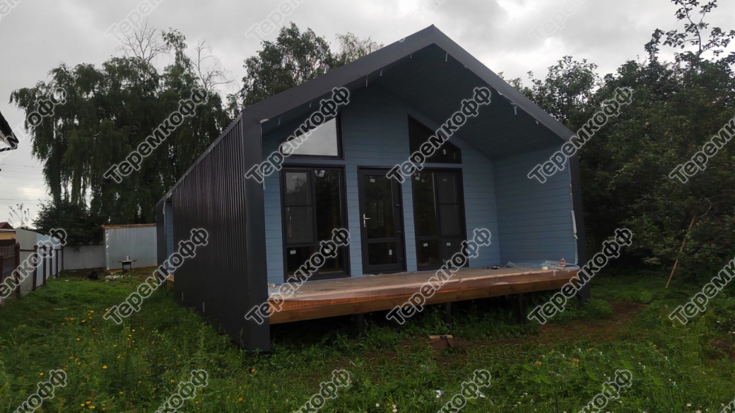 Кровля дома покрыта цветным профилированным настилом Grand Line RAL 7024.