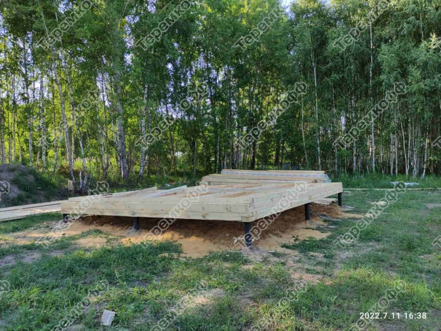 Для фундамента дома использованы винтовые металлические сваи. Размер свай 108х2500 мм. Дом строили на основе деревянного каркаса, ширина которого 100 мм.