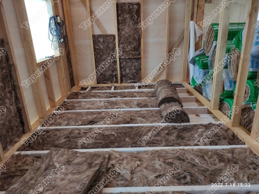 Утепление каркасных стеновых ограждений сделано из теплоизоляционных минераловатных матов, толщина которых 100 мм.