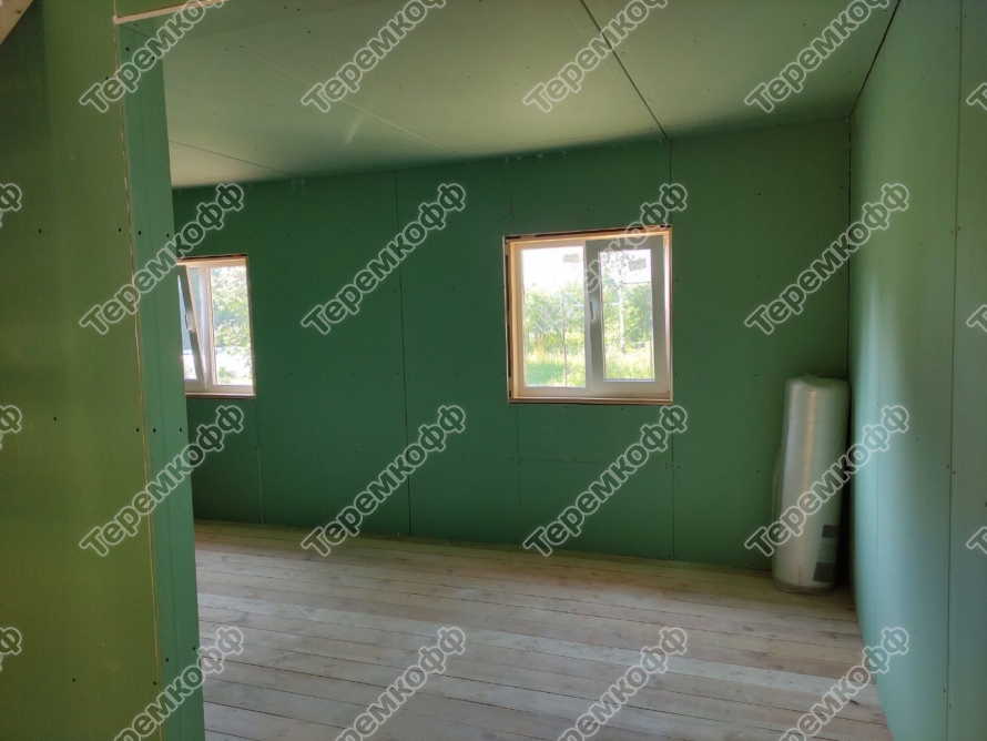 Поверхности стен внутри дома покрыты плитным материалом ГКЛВ 12 мм (гипсокартонные влагостойкие листы).