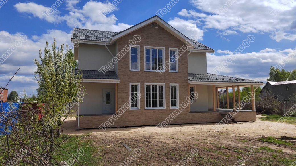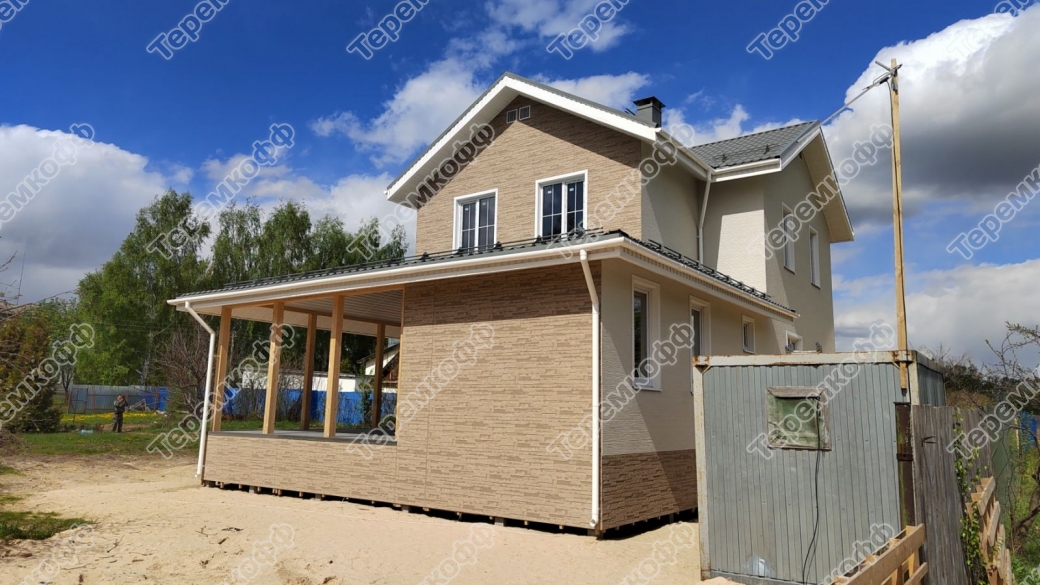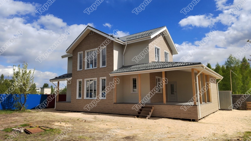 Фасад и цоколь фундамента отделаны фасадными панелями Kmew (Kmew(CW1817GC, Kmew.CW1817GC/CW2121GC). Внутри дома стены и потолки отделаны влагостойким гипсокартоном 12 мм. Настил пола из OSB 15 мм. На террасе и крыльце использовали террасную доску Tehno Crown 3D (146х24).