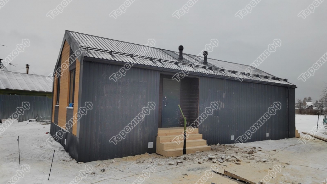 - Наружная отделка - стены обшиты имитацией бруса сорт АВ (сосна), толщина доски 15 мм. Окраска фасада и кровельных свесов краской ТИККУРИЛА (ral 3134, ral X502).