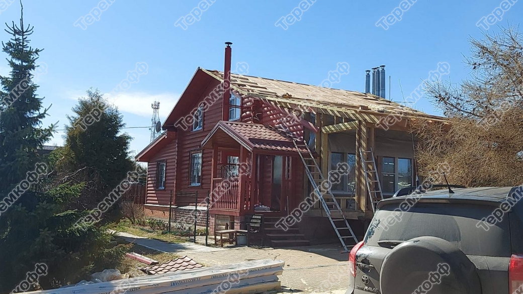 Для кровли сделано совмещение стропильной системы пристройки и дома. Кровля покрыта металлочерепицей Гранд лайн. На кровле смонтирована водосточная система и снегозадержатели Гранд лайн.