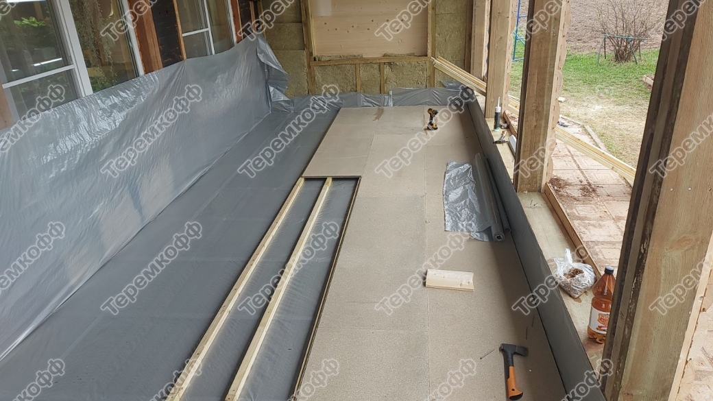 Полы покрыты влагостойкой, уровень влагостойкости Р5, шпунтованной плитой ДСП Quickdeck, толщиной 22 мм.