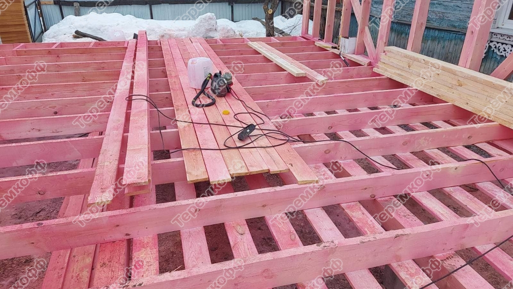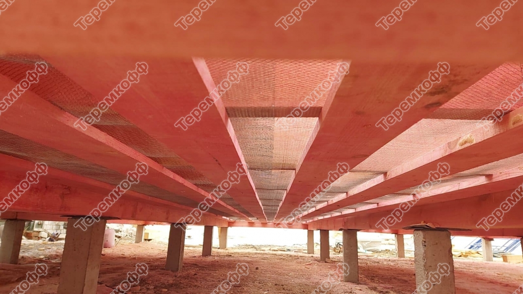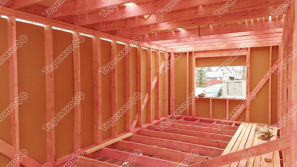 - Деревянный каркас строения смонтирован шириной 150 мм по всей его окружности.