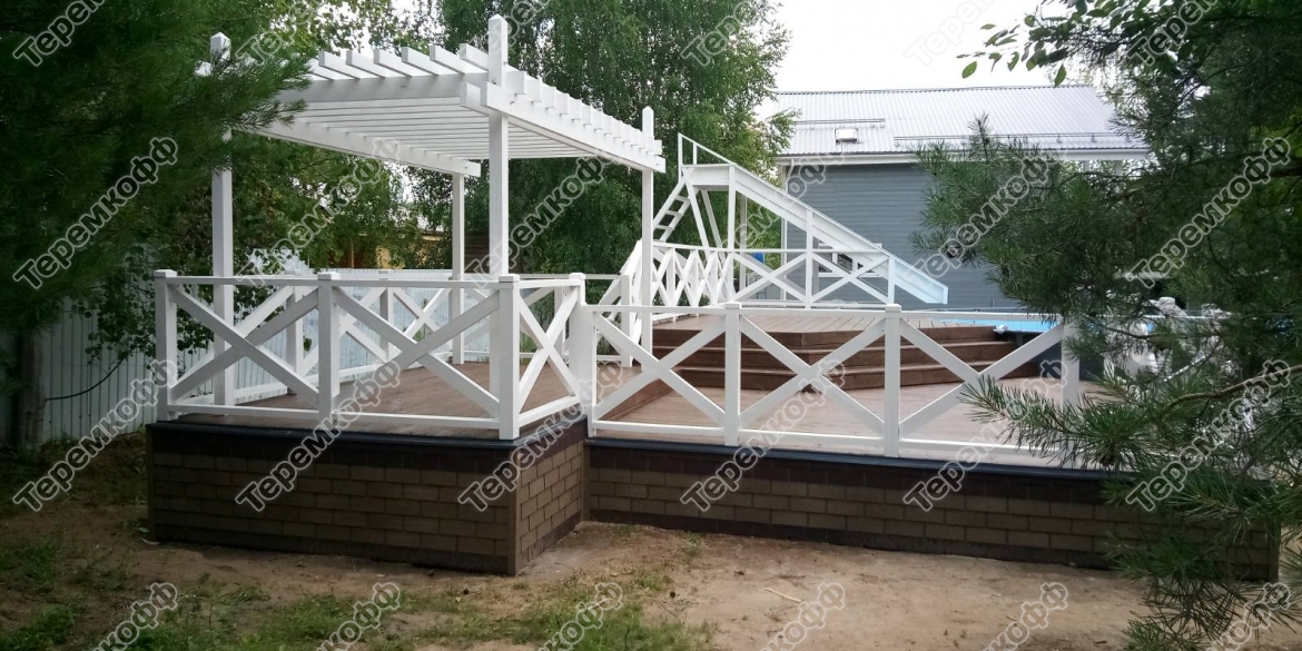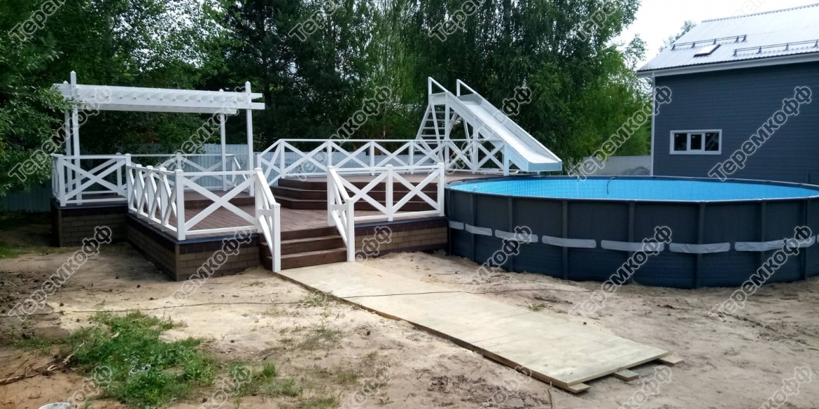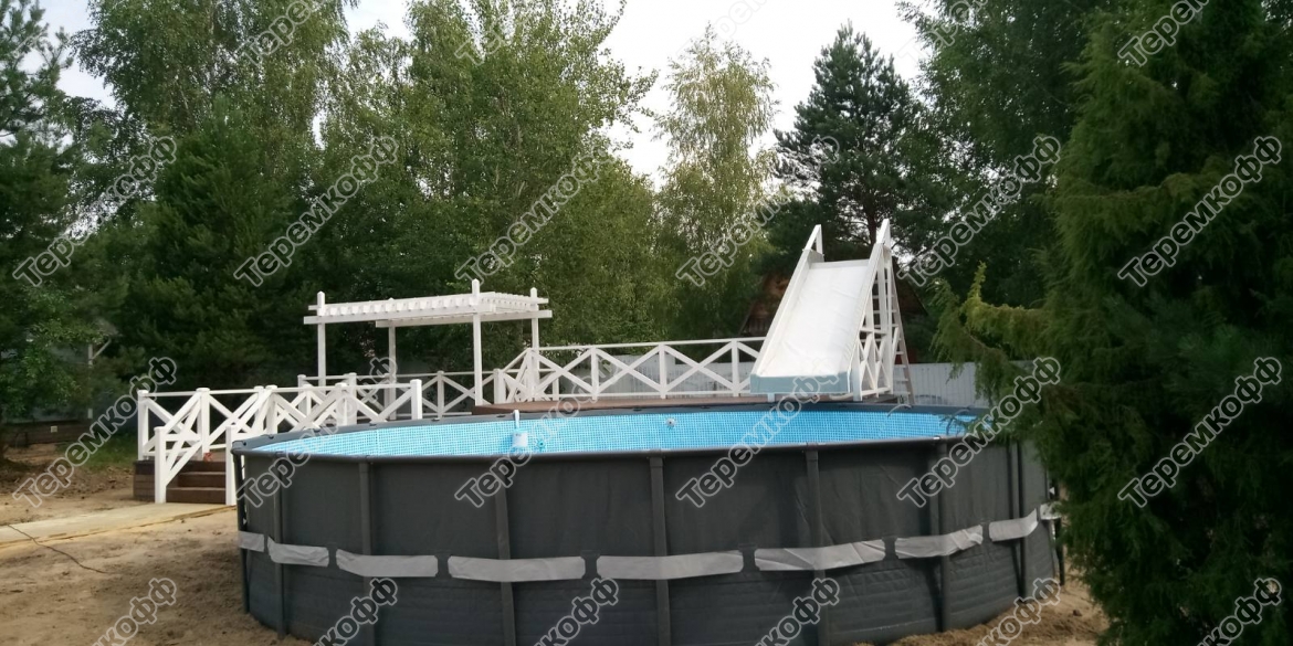 Ограждения, перголу и горку выполнили из сухой строганой доски. Все эти элементы покрасили белой краской «Тиккурила». Бассейн диаметром 7300мм заказчик покупал сам. Мы только произвели его монтаж. Фундамент обшили фасадной плиткой Хауберк.
