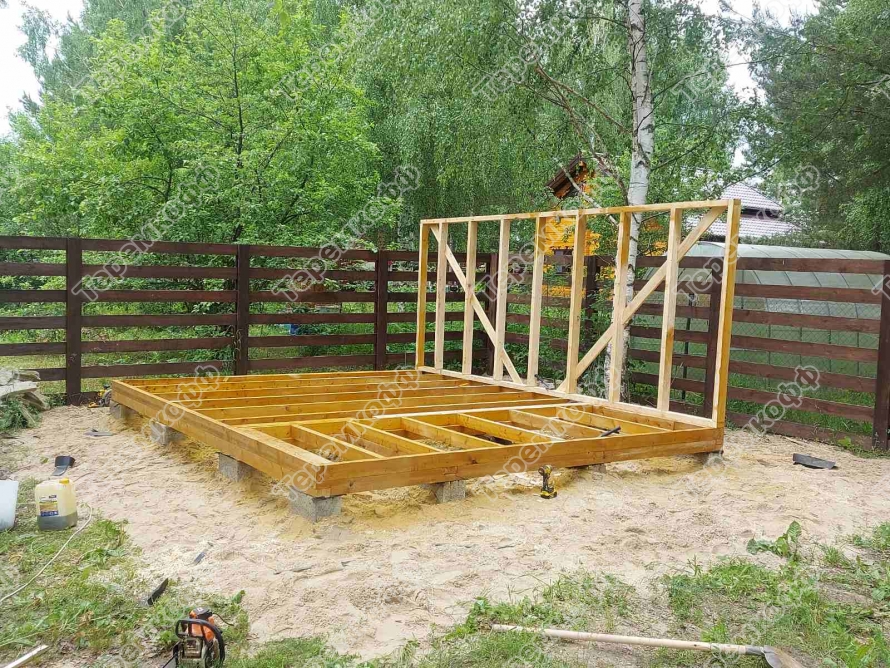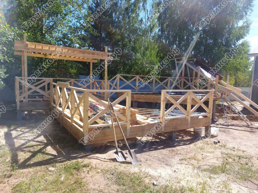 Главной изюминкой комплекса работ стала терраса с бассейном. Под нее, так же, был сделан железобетонный фундамент. Основание террасы сделали из сосновой доски. Настил пола выполнили террасной доской (лиственница) и покрыли террасным маслом Тиккурила.
