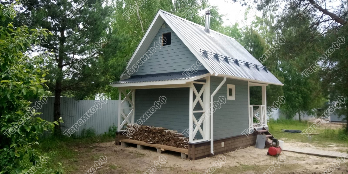 Построили хозяйственный блок с двумя входами на фундаменте из бетонных блоков. Наружную отделку покрасили краской Тиккурила. Фундамент зашили фасадными панелями Хауберк.