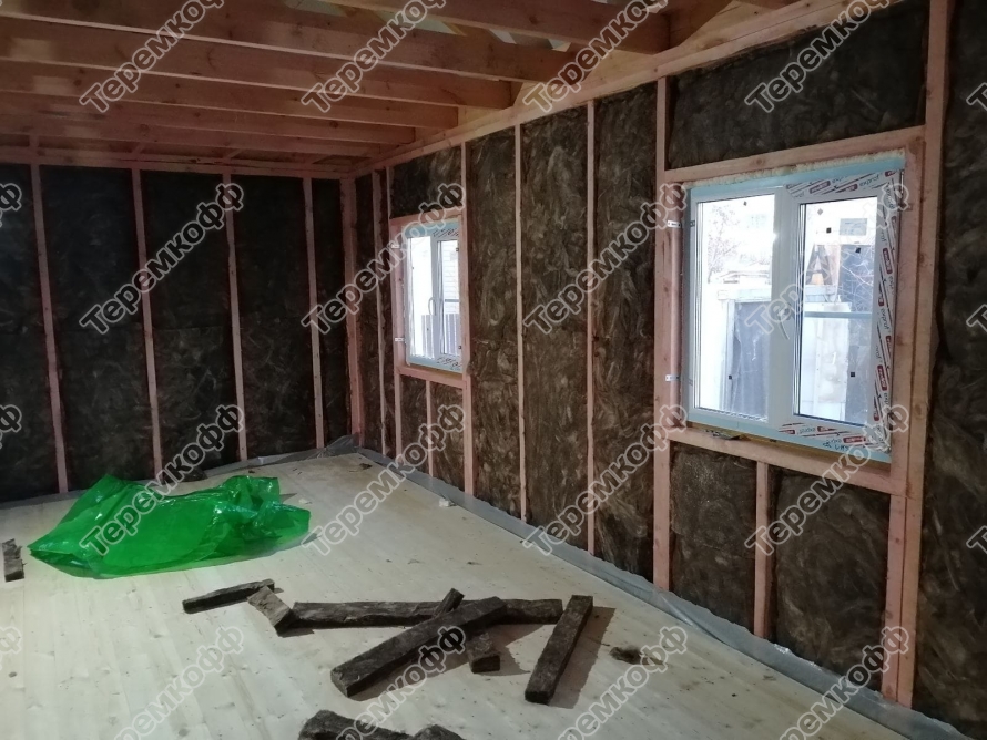 Если устанавливают диффузионную мембрану или планируют вентзазор между внутренней отделкой и паробарьером, то барьер крепится к стойкам рейками. К рейкам монтируется внутренняя отделка, за которой остается вентзазор, куда будет выходить влажный воздух из теплоизоляции.